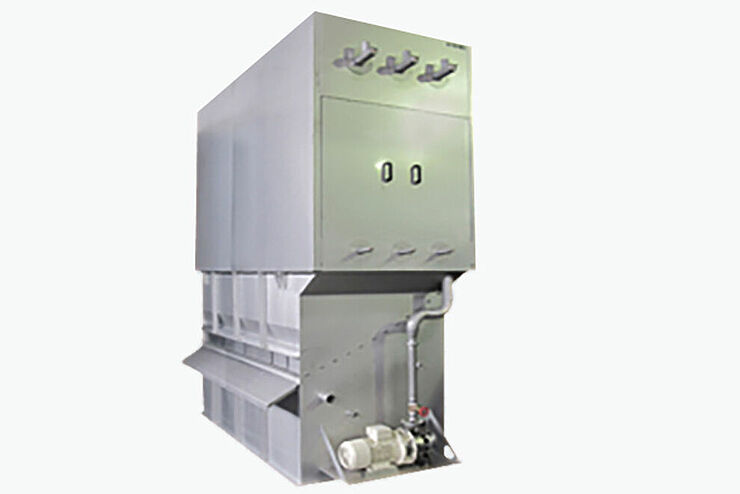 Our industrial ice maker machine uses vertical, water-sprinkled evaporator plates and cyclic hot gas defrosting. The ice forms on the stainless-steel plates to a thin layer, which keeps thermal resistance low. After a few minutes, the ice is defrosted via automatic hot gas control. The ice breaks into roughly hand-sized pieces, which are separated from the water on a suction slide and then crushed in a rotating icebreaker. The crushed ice falls down the full length of the Industrial Ice Maker and is available for transport with a conveyor belt or auger in the ice factory or industrial food processing. Both the ice thickness and the piece sizes can be adjusted continuously. Our Industrial Chip Ice Maker gives you maximum power reserve and safety in production. Plus, there are only a few moving parts, which increases operational reliability and minimizes maintenance. With our crusher systems, you can adjust the falling ice chips from your Industrial Ice Maker in adjustable ice chips with thickness ranging from 4mm to 12mm. Our Ice Storage systems can be adjusted as well. Get the most out of your ice maker and improve your production with the best industrial ice maker on the market.